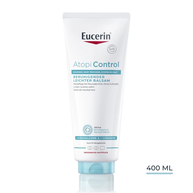 Le Baume Apaisant Eucerin® AtopiControl est un baume pour le corps convenant pour un usage quotidien et spécialement formulé pour apaiser et hydrater intensément les peaux très sèches, irritées et sujettes aux démangeaisons. Ce baume huile-dans-eau, léger mais nourrissant, est enrichi en Licochalcone A apaisante, en Céramides et en beurre de Karité pour renforcer la barrière cutanée et soulager la sécheresse et les sensations de démangeaisons*. Il hydrate instantanément la peau pour la rendre douce et lisse et, avec une application régulière, l'état de la peau s'améliore sensiblement.
