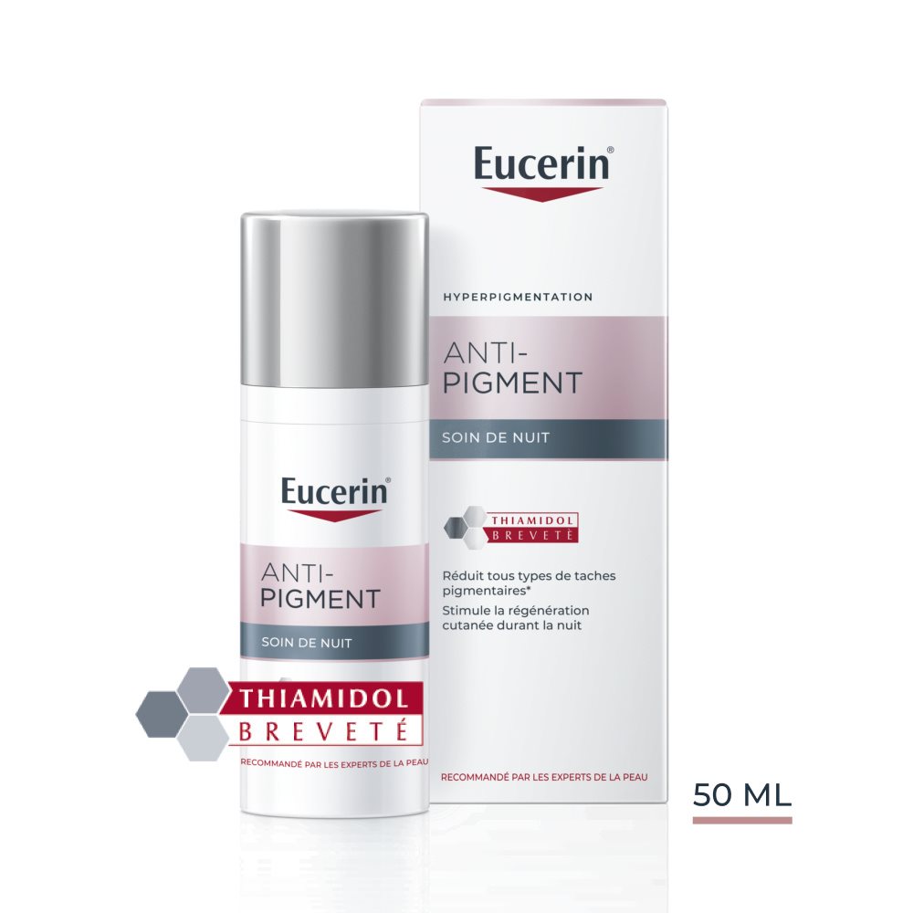 Le Soin de nuit Eucerin® Anti-Pigment contient du Thiamidol®, un ingrédient efficace et breveté qui agit à la base de l'hyperpigmentation en réduisant la production de mélanine dès le premier jour. Les premiers résultats sont visibles dès 2 semaines grâce à une utilisation régulière. Des tests scientifiques ont prouvé qu'il réduit les taches pigmentaires et empêche leur réapparition.