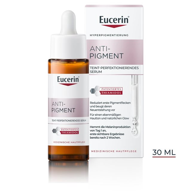 Le Sérum Éclat Eucerin® Anti-Pigment contient de l’Acide Hyaluronique concentré qui améliore le taux d’hydratation de la peau. Il augmente aussi l’efficacité du soin de jour et du soin de nuit Eucerin® Anti-Pigment. Pour obtenir les meilleurs résultats, nous vous recommandons de l’associer à d'autres produits de soin de la gamme Eucerin® Anti-Pigment.