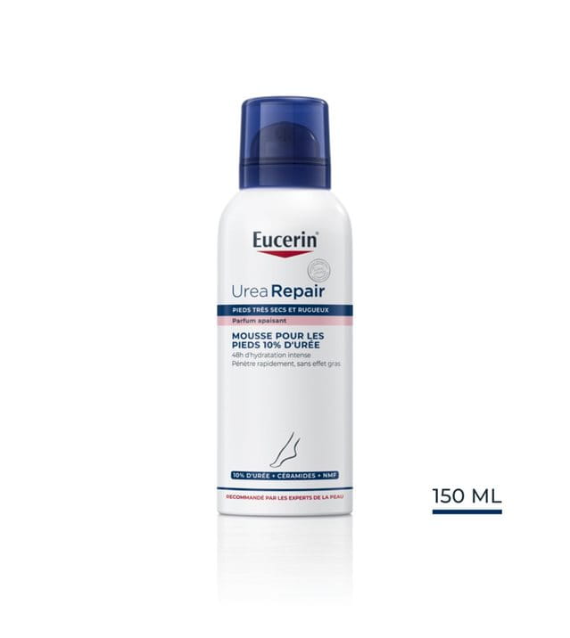 Eucerin UreaRepair Mousse Pieds 10% Urée procure à la peau très sèche, rugueuse des pieds l'hydratation intense dont elle a besoin. Cette mousse contient une combinaison unique d’ingrédients – 10 % d'Urée, Céramide et autres Facteurs naturels d'hydratation (NMF) – qui retiennent l'eau et soutiennent la réparation de la barrière protectrice naturelle de la peau pour la protéger contre une perte d’hydratation supplémentaire. Ces ingrédients agissent aux côtés du Dexpanthénol, qui favorise la régénération rapide de la peau et du Décanediol, qui aide à réduire le risque de développement de microorganismes. Par conséquent, la mousse pour les pieds augmente la résistance de la peau des pieds sujets aux mycoses.