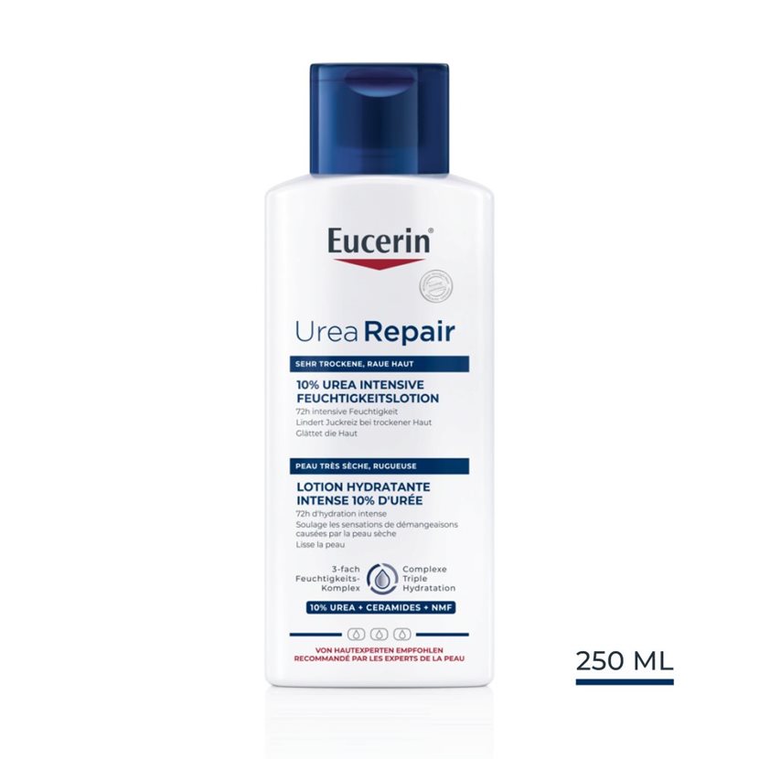Eucerin UreaRepair Lotion Hydratante Intense pour peaux extrêmement sèches 10% Urée contient de l'Urée à haute concentration et d'autres Facteurs Naturels d'Hydratation (pour retenir l'eau dans la peau), ainsi que des Céramides (pour renforcer la barrière cutanée et réduire la perte insensible en eau). La formule apaise immédiatement et continue d'agir, retardant la réapparition des signes de la peau très sèche, rugueuse, jusqu’à 72 heures.