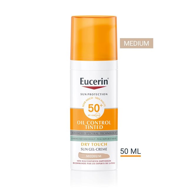 Eucerin SUN Face Oil Control Gel-Creme Tinted medium SPF 50+ est une protection solaire teintée à usage quotidien pour les peaux grasses et sujettes aux imperfections, qui unifie immédiatement le teint et matifie durablement.